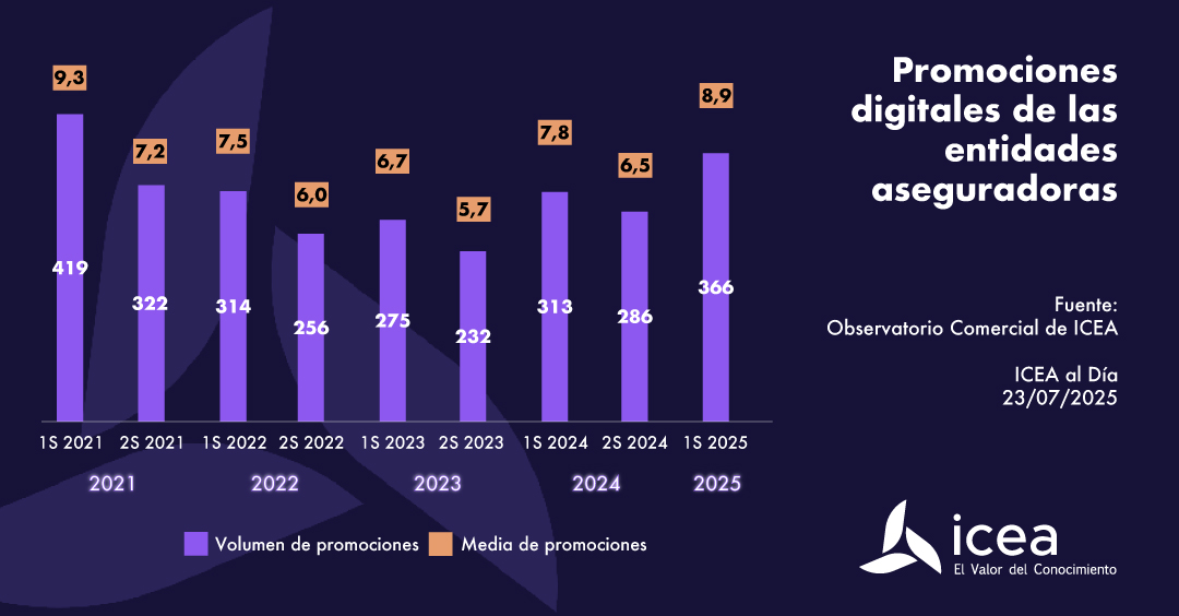 En el primer semestre la actividad promocional digital de las aseguradoras alcanzó el mayor nivel de los últimos cuatro años. Solo la media de promociones por compañía pasó de 6,5 en el último tramo de 2024 a 8,9 en estos seis primeros meses del año, según los datos de ICEA. Por ramos, Hogar lideró el crecimiento en este periodo, por delante de Autos y Salud. Precisamente, Salud continúa siendo el segmento con mayor actividad promocional digital, reafirmando su liderazgo en el entorno online.