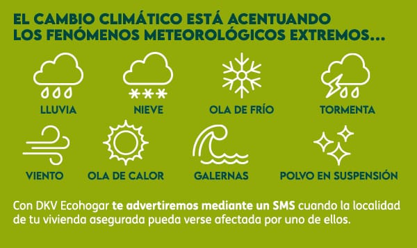 Los asegurados de Hogar de DKV tienen a su disposición ClimAlert, un servicio que pronostica y advierte mediante SMS a todos aquellos asegurados cuya vivienda pueda verse comprometida por las previsiones de la Agencia Estatal de Meteorología (AEMET) sobre fenómenos climáticos severos o extremos.