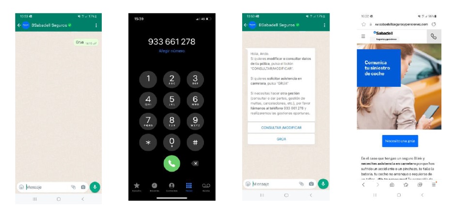 La operativa es muy sencilla. Los clientes de Blink Auto tienen 4 maneras distintas de acceder al servicio: escribir directamente GRÚA en su chat; seleccionar la opción de "Seguir por WhatsApp" en la llamada; seleccionar la opción GRÚA en el menú (opción solo para registrados) o con el botón NECESITO UNA GRÚA en la web de Sabadell Seguros.
