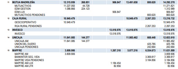 El resto de los grupos aseguradores incluidos en este ranking son: Nationale-Nederlanden, en el 64º puesto (774,43 millones de euros y todo gestionado en Fondos de Pensiones); Generali, 73º puesto (391,63 millones y todo en Fondos de Pensiones); Loreto Mutua, 74ª posición (373.23 millones de euros y casi todo en IIC); PSN, 91º puesto (69,35 millones y todo en Fondos de Pensiones); Surne, 101ª posición (9 millones y todo en Fondos de Pensiones) y cierra hna, en el 102º puesto (7,2 millones en Fondos de Pensiones).