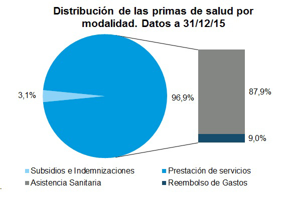El volumen de primas del ramo de Salud creció en 2015 un 3,1% anual, alcanzando los 7.343 millones de euros, impulsado por la modalidad de Asistencia Sanitaria, que registró un avance del 3,34%. Reembolso de Gastos crece un 2,43%, mientras que Subsidios e Indemnizaciones decreció un 2,34%.