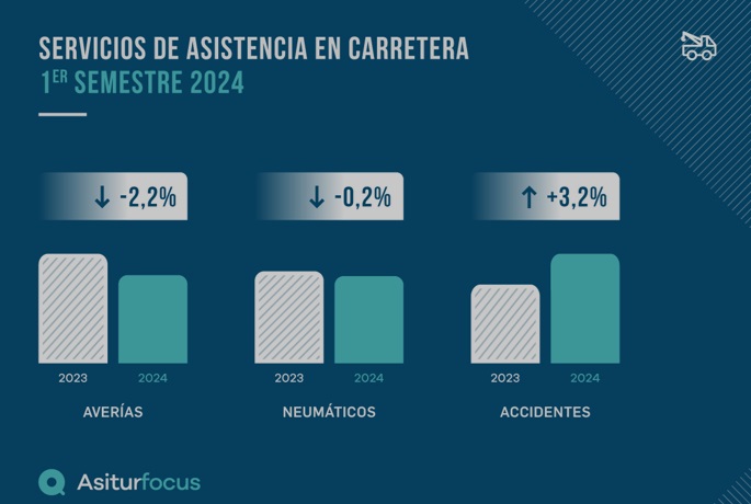 Las asistencias en carretera durante el primer semestre de 2024 se han mantenido prácticamente igual que en mismo periodo del año anterior, excepto las derivadas de accidentes de tráfico que han experimentado un repunte del 3,2%, según datos del Observatorio de siniestros AsiturFocus.