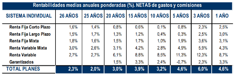 En resumen, la práctica totalidad de las categorías han obtenido rentabilidades positivas en todos los plazos. A 20 años, los Planes de Pensiones registran una rentabilidad media anual (neta de gastos) del 3% y, en el medio plazo (10 y 15 años), del 3,2% y 3,9%, respectivamente.