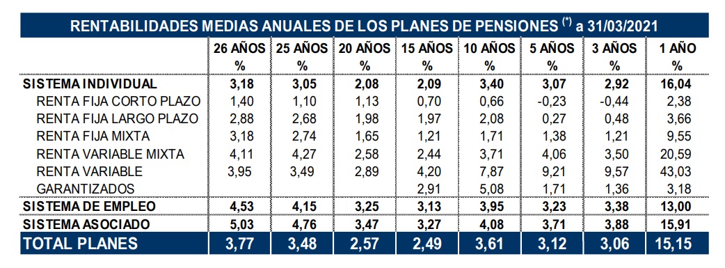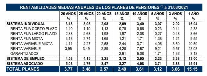 De esta forma, los Planes de Pensiones presentan unas rentabilidades positivas en todos los plazos, especialmente en la rentabilidad acumulada a 1 año, donde el rendimiento medio neto de gastos y comisiones alcanza el 15,15% total de sistemas.