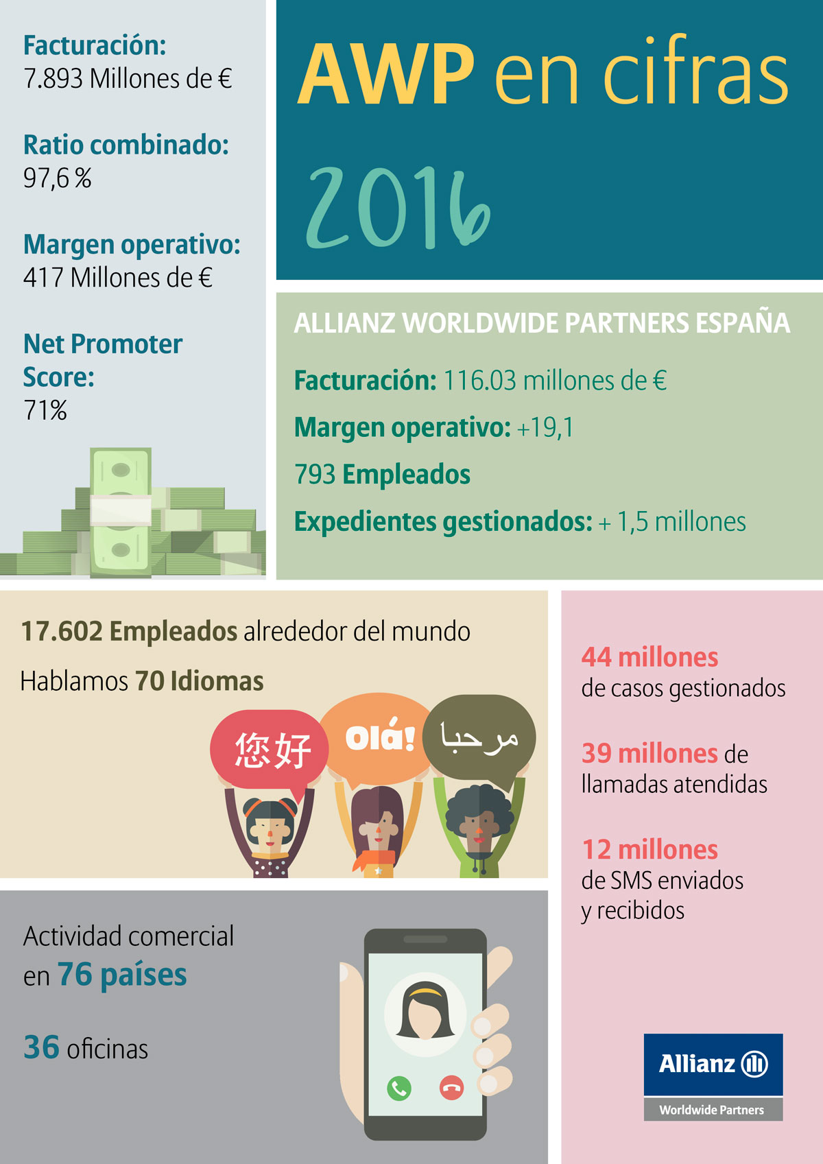 "Estamos seguros de que alcanzaremos nuestros objetivos en 2017 y continuaremos en la dirección adecuada para lograr nuestra ambición 2020 (10.000 millones euros y 500 millones de euros de beneficio.) Nuestra sólida organización, conocimiento de los objetivos estratégicos y retos de nuestros clientes, y nuestra amplia gama de soluciones digitales junto a la dedicación de nuestro equipo de profesionales, son activos que continuarán diferenciándonos en nuestro mercado", concluye Remi Grenier, presidente de Allianz Worldwide Partners.