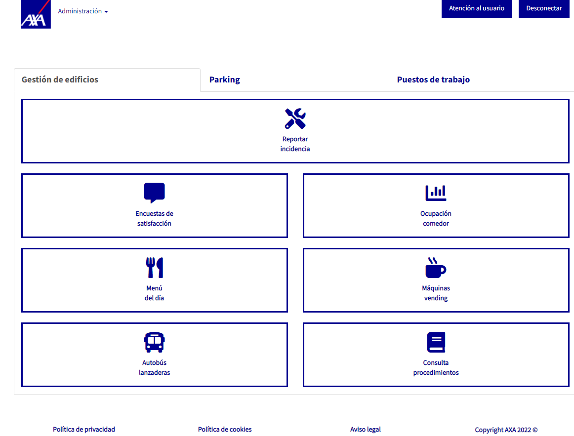 La aplicación de AXA facilita los servicios a los empleados, mejora la toma de datos de calidad y aporta valor a la organización. Consta de 3 módulos principales centrados en el control de la ocupación, la gestión propia del edificio (con servicios como el take away de comidas o la declaración de incidencias) y la gestión del parking (cesión o petición de plazas).