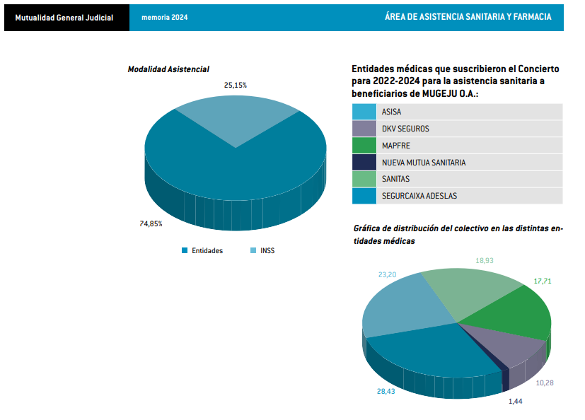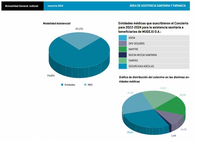 La Mutualidad General Judicial (Mugeju) ha publicado en su Portal de Transparencia la Memoria correspondiente al ejercicio 2024. En ella, se constata que el 74,85% del colectivo protegido por Mugeju estaba adscrito el año pasado a alguna de las entidades de seguro concertadas para asistencia completa, mientras que el 25,15% se encontraba adscrito al INSS.