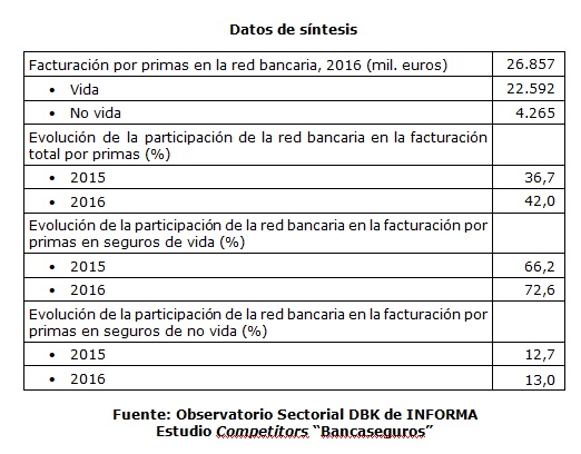 El peso de la red bancaria en la facturación total por primas ha alcanzado el 42% en 2016 con un valor de primas intermediadas de 26.857 millones de euros, que supone un 28,7% más en relación con 2015. Son datos que se desprenden del Observatorio Sectorial DBK de Informa que concluye que durante 2016 se produjo un notable aumento de la participación de las entidades bancarias en la estructura del canal del sector asegurador, gracias al fuerte impulso del negocio de seguros de Vida, apreciándose paralelamente una pérdida de importancia de los mediadores tradicionales, más expuestos a los seguros de No Vida. El volumen de negocio de este canal en No Vida fue en 2016 del 13%, sin embargo en Vida su penetración llega casi al 73%.