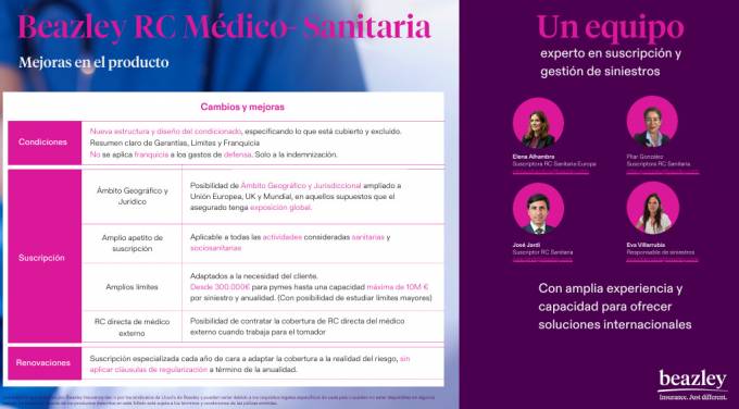 Beazley ha presentado una nueva versión del producto de Responsabilidad Civil Médico-Sanitaria. Indica la entidad que está adaptada a la "realidad del mercado y con coberturas ampliadas". El producto está desde inicio de este mes disponible para su comercialización a través de corredores que trabajan con la aseguradora.