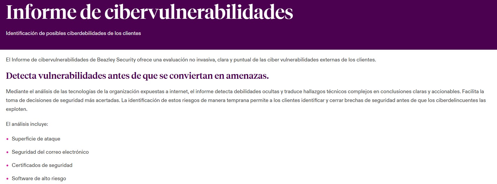 Beazley ha elaborado un nuevo 'Informe de Cibervulnerabilidades' (en inglés se conoce como 'Security Posture Report'). Se trata de una herramienta para que las empresas puedan evaluar de forma objetiva y no invasiva la exposición real a los ciberriesgos a partir del análisis de las tecnologías visibles desde internet. Por tanto, permite a las empresas obtener una visión clara y objetiva de sus debilidades externas.