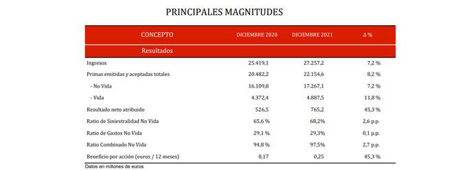 Los ingresos del Grupo han crecido un 7,2% en el año 2021, hasta superar los 27.257 millones de euros, en tanto que las primas alcanzaron los 22.155 millones de euros, lo que supone un crecimiento del 8,2%.