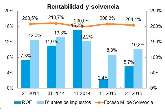 Los indicadores de rentabilidad del sector siguen registrando datos muy positivos, si bien se detecta cierto deterioro respecto a ejercicios anteriores, según destaca ICEA. El beneficio antes de impuestos sobre primas imputadas fue del 10,2%, frente al 12,6% registrado en el primer semestre de 2014. La rentabilidad sobre recursos propios (ROE) fue del 5,7%, reduciéndose en 1,6 puntos porcentuales (pp) en términos interanuales. Por su parte, el exceso de margen de solvencia alcanzó la cifra de 204,4% (4,1 pp. menos que en el mismo periodo de 2014), siendo de 120,5% y 313,5% para el ramo de Vida y no Vida, respectivamente.