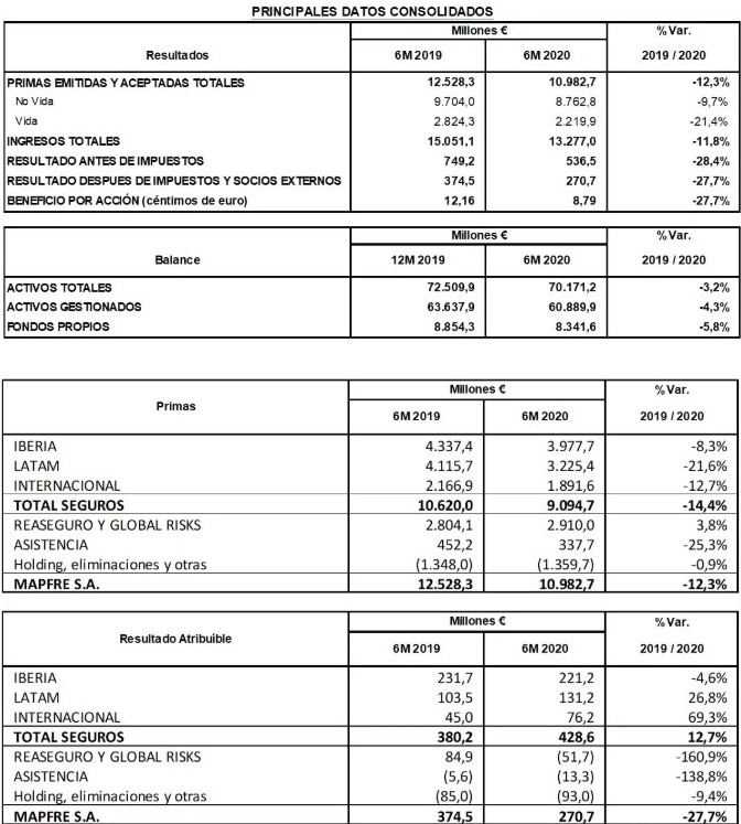 El volumen de primas se ha situado en los primeros 6 meses del año en los 10.983, lo que indica una caída del 12,3% respecto a junio de 2019. Según explica la aseguradora, el descenso se "enmarca en un contexto de caída de actividad económica causada por la crisis del Covid-19" iniciada en marzo y que se ha agudizado durante el segundo trimestre y ha impactado a todos los países.