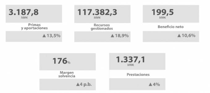El total de primas y aportaciones en este periodo ha crecido un 13,5% y ha alcanzado los 3.187,8 millones de euros (29 millones provienen de Bankia Vida), impulsado por los seguros de Ahorro y el segmento de protección individual.