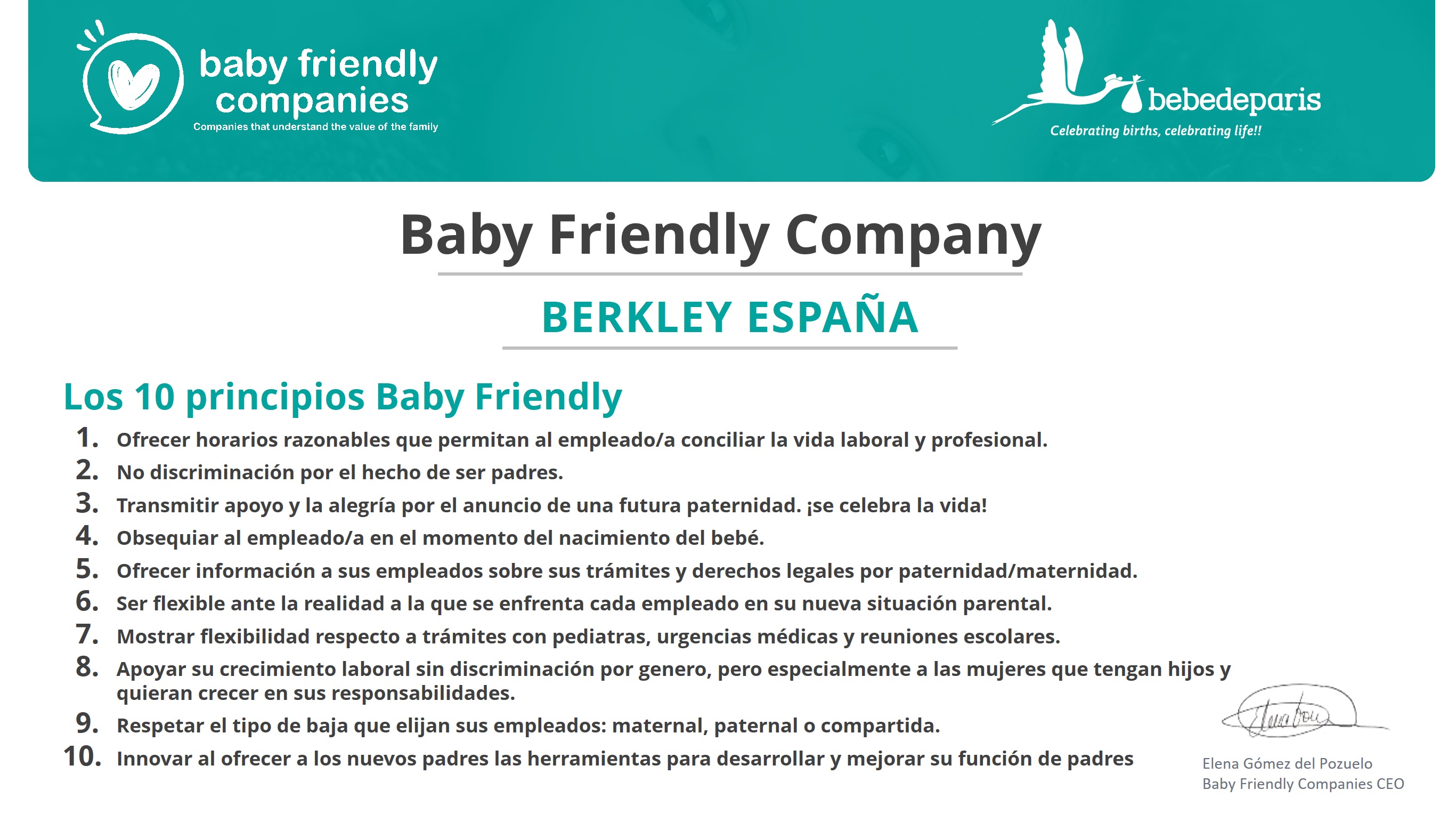 Berkley España se ha unido al programa Baby Friendly Companies con el objetivo, según explica, de "apoyar y fomentar la conciliación familiar entre sus empleados". Por ello, la entidad ha tomado la decisión de formar parte de este movimiento creando un acompañamiento para los nuevos padres y madres de la compañía, garantizando y respetando los 10 principios de este programa.