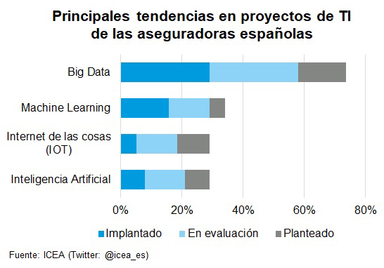 Los principales proyectos que están abordando o se están planteando las aseguradoras españolas, en el área de TI, están relacionados con el Big Data, con un 29% de entidades con proyectos ya implantados, más otro 29% de las mismas que los tienen en evaluación y un 16% planteados, según datos de ICEA. Respecto al Machine Learning, Internet de las Cosas (IoT) e Inteligencia Artificial (IA), los datos de la última estadística de TI muestran que el número de entidades con proyectos implantados oscila entre un 5% y un 16%, aunque están siendo evaluadas o ya planteadas por más entidades. Estas tecnologías son algunas de las consideradas como 'exponenciales', ya que posibilitan una transformación o mejora exponencial de una industria, según explica ICEA.