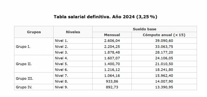 Tras la reunion entre los representantes empresariales y los sindicatos del pasado 31 de marzo se procedió a la aplicación del artículo 45 del convenio colectivo, sobre condiciones económicas para el año 2024, y a la disposición adicional décima, sobre la modificación excepcional de las tablas salariales para los años 2023 y 2024. Esta tabla salarial definitiva será el punto de partida para el pago de los salarios desde 1 de enero de 2025, así como a efectos del pago retroactivo con efectos 1 de enero de 2024.
