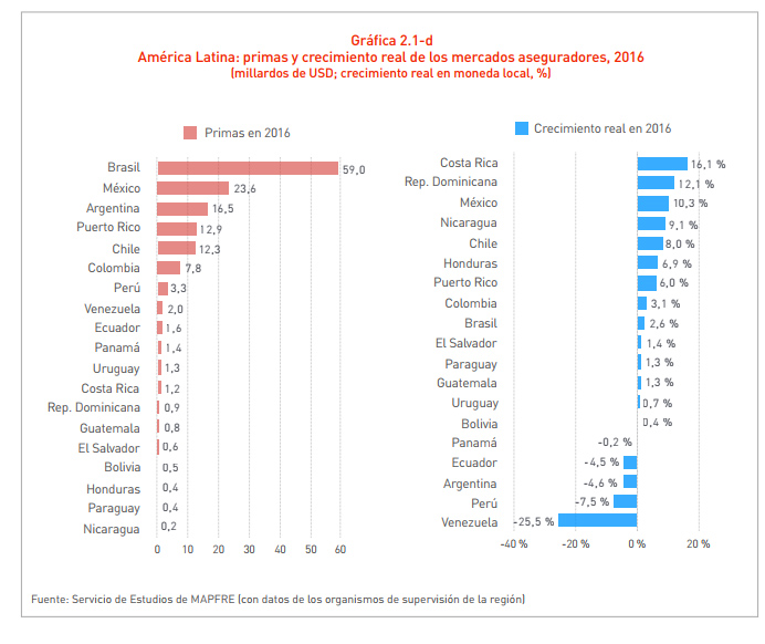 Brasil cuenta con 59.000 millones en primas liderando el mercado de la región, seguido de México con algo menos de la mitad y por delante de Argentina, Puerto Rico y Chile. En 2016 fue Costa Rica el país que más creció en primas con un avance del 16,1%, seguido de la República Dominica con el 12,1% y México con el 10,3%. Brasil creció en primas un 2,6%.