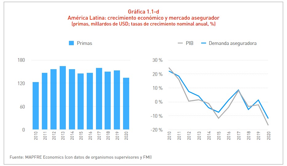 Son datos del informe 'El mercado asegurador latinoamericano en 2020' elaborado por Mapfre Economics y la Fundación Mapfre y que en unos minutos será presentado a los medios de comunicación.