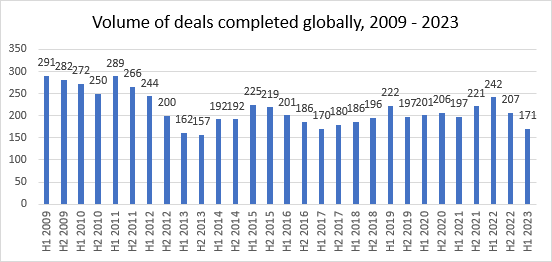 En el primer semestre de 2023, se han completado en todo el mundo 171 operaciones de fusiones y adquisiciones (M&A, en sus siglas inglesas) relacionadas con en el sector asegurador. Se trata de un 29,3% menos que en el mismo periodo del ejercicio anterior, cuando se llevaron a cabo 242, y de una reducción del 17,4% respecto a diciembre de 2022, cuando se registraron 207. Así consta en el informe 'Insurance Growth Report', elaborado por la firma internacional de abogados Clyde & Co.