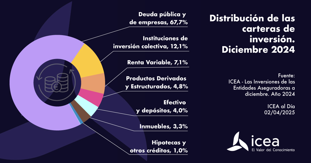 A cierre de 2024, la deuda pública y de empresas suponía el 67,7% de la cartera de inversiones del seguro español. Son casi 5 puntos menos que en septiembre, cuando se elevaba hasta el 72,2%, según las estadísticas difundidas por ICEA.