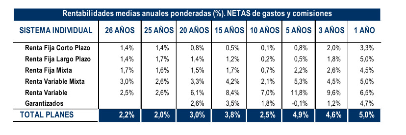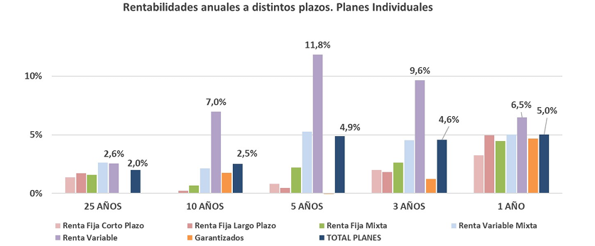 Prácticamente todas las categorías en todos los plazos obtienen rentabilidades positivas, con especial relevancia en el medio-largo donde a 20 años los Planes de pensiones registran una rentabilidad media anual del 3% y, en el medio plazo (10 y 15 años), presentan una rentabilidad del 2,5% y 3,8% respectivamente.