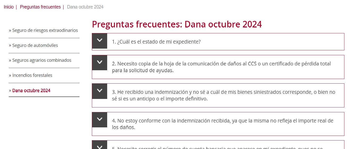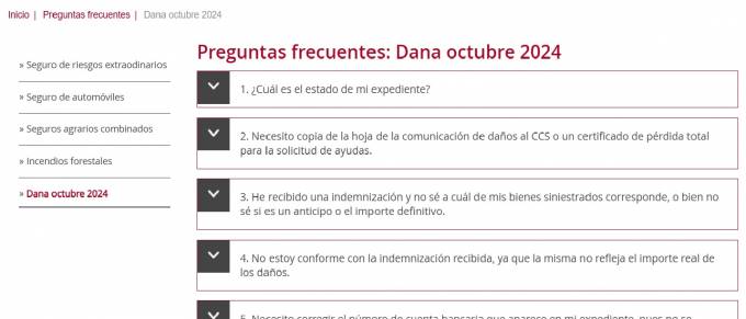 Son 13 preguntas en las que se da respuesta entre otras cuestiones a preguntas como "¿Cuál es el estado de mi expediente?", cómo corregir el número de cuenta bancaria, "¿Es necesario renovar el seguro con mi entidad aseguradora para poder cobrar la indemnización del siniestro de la DANA?" o "¿Qué criterios de valoración se aplican para valorar los vehículos siniestrados?".