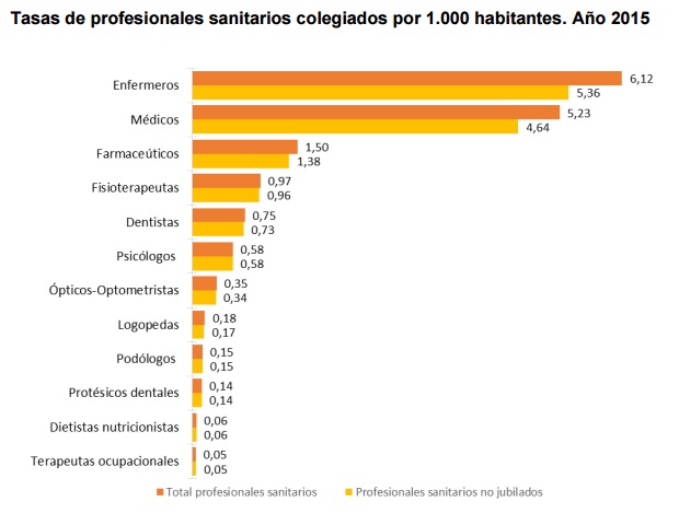 No obstante, el nº de profesionales sanitarios colegiados por cada 1.000 habitantes difiere según el colectivo. En 2015 el de enfermeros presentó la mayor tasa (6,12 por 1.000 habitantes), seguido de médicos (5,23) y farmacéuticos (1,50). Por el contrario, las tasas más bajas se alcanzaron en los colectivos de terapeutas ocupacionales (0,05), dietistas nutricionistas (0,06) y protésicos dentales (0,14).