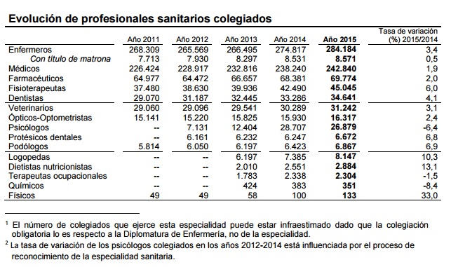 El número de médicos colegiados en España aumentó en 4.600 personas en 2015 (+1,9% más) hasta alcanzar un total de 242.840, según el INE. También subió el de enfermeros colegiados, en 9.367 personas (+3,4%), hasta los 284.184.