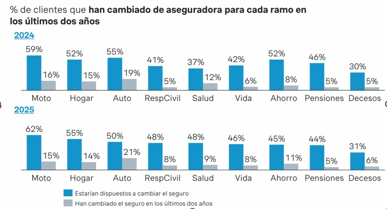 Los clientes con mayor predisposición al cambio de compañía son los de Autos, seguidos de los de Moto y Hogar. El precio sigue siendo el factor determinante, aunque ganan importancia las prestaciones y el atractivo de coberturas.