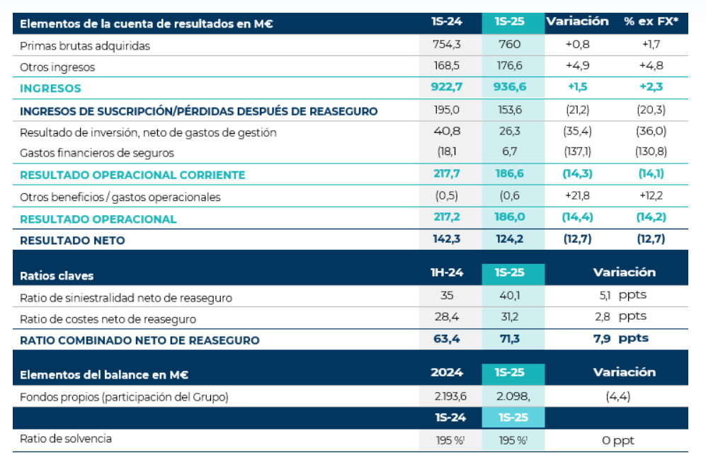 La siniestralidad neta creció 5,3 puntos hasta el 40,1% y el ratio combinado neto aumento en 7,9% hasta el 71,3%.