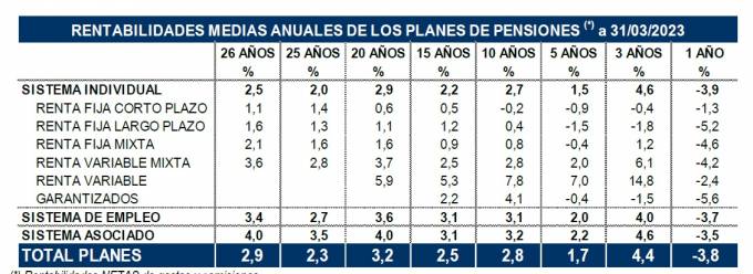 A largo plazo, la rentabilidad permanece positiva. A 26 años, la rentabilidad media anual se sitúa en el 2,9% para el total de Planes, y en el medio plazo (10 y 15 años), presentan una rentabilidad del 2,8% y 2,5% respectivamente.