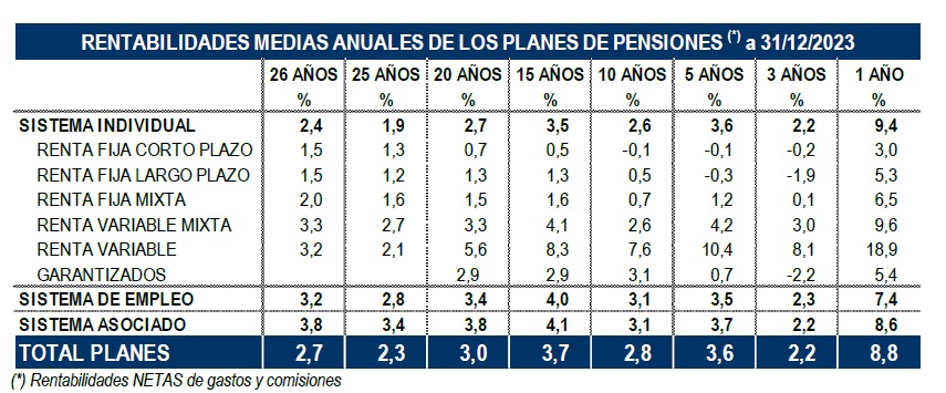 Destaca la rentabilidad de los Planes de renta variable a un año alcanzó un espectacular 18,9%.Todas las rentabilidades superan el 2%. Así en el largo plazo, la rentabilidad a 26 años, la rentabilidad media anual se sitúa en el 2,7% para el total de Planes, y en el medio plazo (10 y 15 años), presentan una rentabilidad del 2,8% y 3,7% respectivamente.