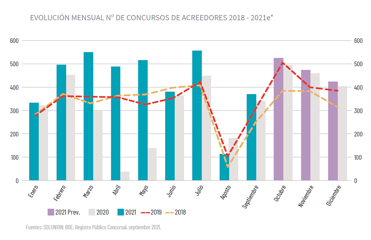 Se prevé que el ejercicio 2021 cerrará con más de 5.000 concursos de acreedores en España. De cumplirse esta estimación, supondrá un crecimiento del 30% respecto al año pasado, una cifra no vista desde 2014. Esta ha sido una de las principales conclusiones extraídas del análisis sobre insolvencias empresariales presentado por Solunion.