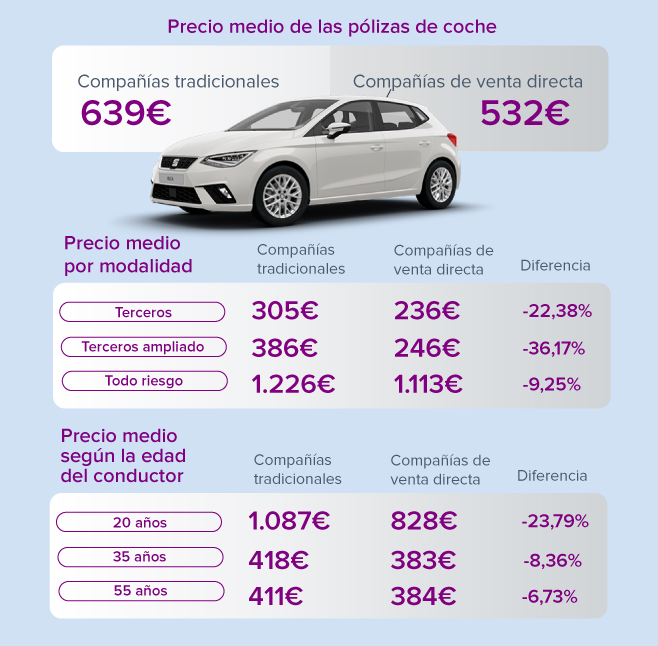 Contratar un seguro de Autos en una compañía de venta directa es de media un 12,96% más barato que en una compañía tradicional, según Kelisto.es. El precio medio de las pólizas en las compañías clásicas se sitúa para los 3 perfiles analizados (conductor de 20 años, de 35 y de 55 años) en 639 euros, una cifra superior a la registrada en las aseguradoras de venta directa, que de media registran una prima de 532,05 euros.