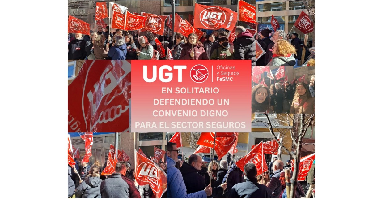 A través de un comunicado, UGT agradece "a todas las personas trabajadoras" que participaron el jueves 19 de febrero en la concentración convocada ante la sede de Unespa. Recordamos que el sindicato rechaza el preacuerdo entre por CCOO y Unespa para seguir con las negociaciones para desbloquear definitivamente la firma del nuevo convenio colectivo del sector asegurador. En concreto, UGT muestra un rechazo frontal en lo pactado en relación con el salario mínimo. "El sector seguros necesita un convenio acorde a su dimensión, su productividad y su importancia estratégica", se resalta en el comunicado publicado.