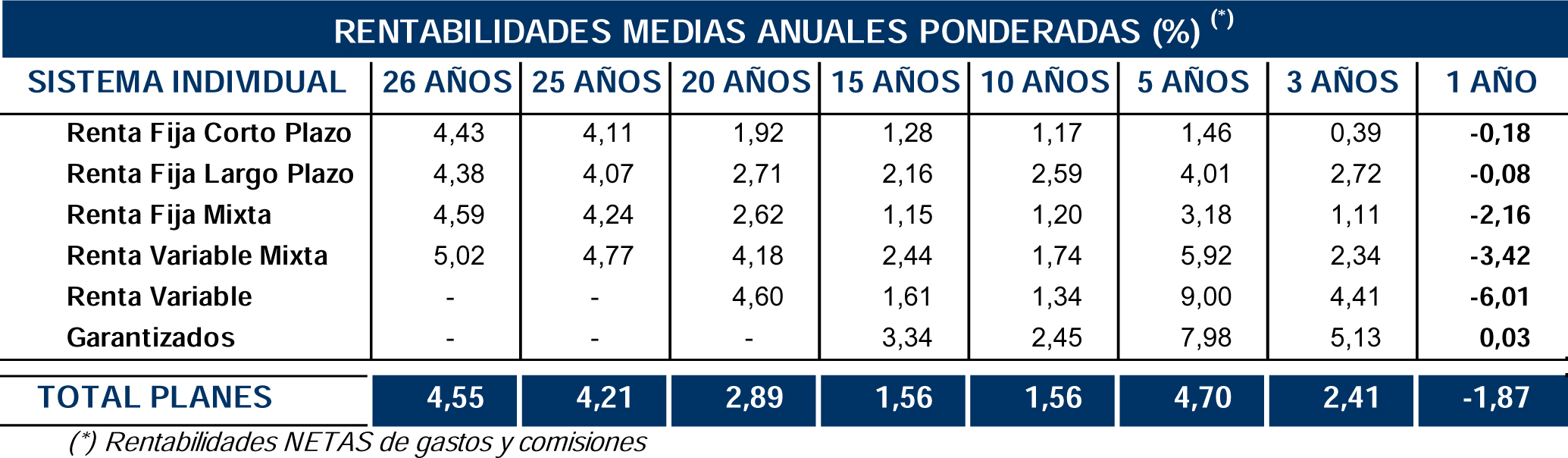 No obstante, en el largo plazo (26 años) los Planes de Pensiones alcanzan una rentabilidad media anual del 4,6% para el total de Planes. En el medio plazo (5 y 10 años) los Planes de Pensiones presentan una rentabilidad media anual del 4,7% y 1,6%, respectivamente.