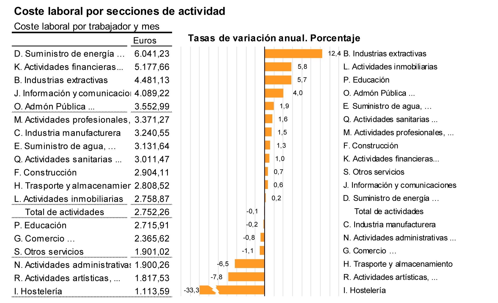 Por sectores económicos, en el de actividades financieras y de seguros el coste salarial fue de 5.177,66 euros, con un incremento del 5,8%. Finanzas y seguros se consolidó como la segunda actividad con mayor coste, solo por detrás del grupo donde el INE incluye suministro de energía eléctrica, gas, vapor y aire acondicionado.