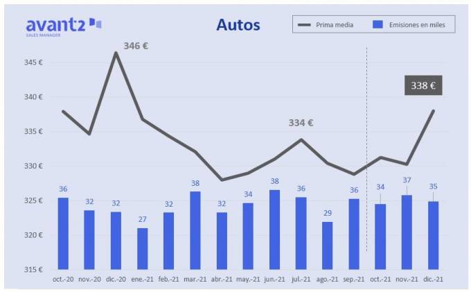 La contratación de seguros de Autos creció un 10% respecto a 2020, con una caída interanual de casi 2,5% en la prima media según datos facilitados por Avant2 Sales Manager, que se quedó en 331 euros. En Motos el precio medio se elevó un 2,7%.