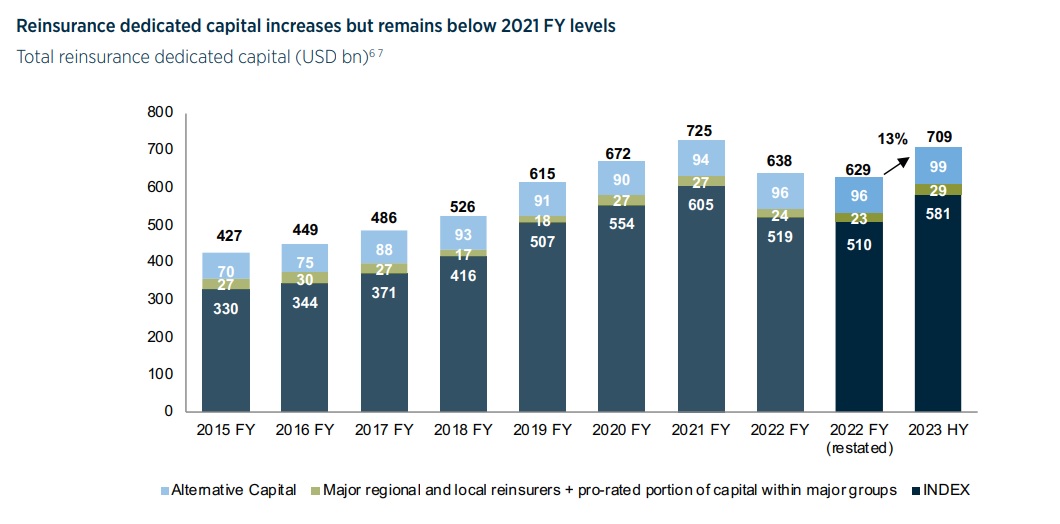 El capital dedicado al sector de reaseguro global ascendió a 709.000 millones de dólares en el semestre de 2023, un 13% más que en todo 2022, según señala el último Informe del Mercado de Reaseguros que publica Gallagher Re.