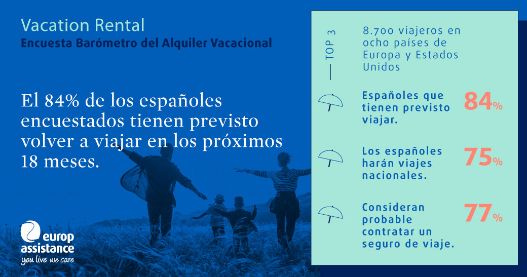 El 84% de los españoles tienen previsto volver a viajar en los próximos 18 meses. De éstos, un 77% contratará seguro de Viaje según se desprende del primer Barómetro del Alquiler Vacacional realizado por Ipsos y Europ Assistance. Supone un incremento del 30% respecto al año anterior.