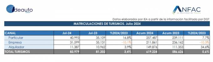 Respecto a las ventas por canales, con un 16,8% de aumento el mercado a particulares registra un notable crecimiento, hasta totalizar 40.993 unidades en julio. Igualmente, las ventas a alquiladores crecen un 3,9%, siendo con los particulares quienes empujar la mejora del mercado general en julio. Por su parte, las empresas registran un fuerte descenso del 10,1% y 31.599 unidades
