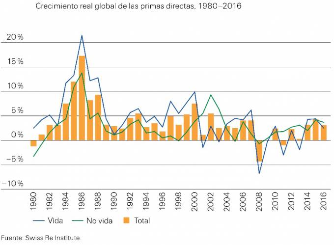 El crecimiento de las primas de Vida globales desaceleró hasta el 2,5 % en 2016, desde un 4,4 % en 2015, ya que las primas disminuyeron en los mercados avanzados, aunque las primas de Vida en el conjunto de las regiones emergentes crecieron más del doble que el promedio a largo plazo. En el lado de No vida, las primas globales aumentaron un 3,7 % en 2016, reflejando una relativamente sólida expansión entre los países emergentes y otro excepcional comportamiento en China.
