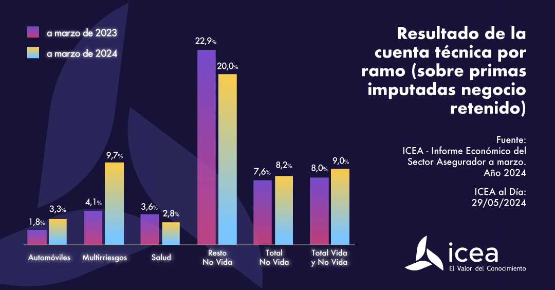 ICEA también hace hincapié en las provisiones, resaltando que el resultado de la cuenta técnica de Vida ha registrado en marzo un ratio del 0,43% en los negocios directo y aceptado, una centésima inferior a marzo de 2023.