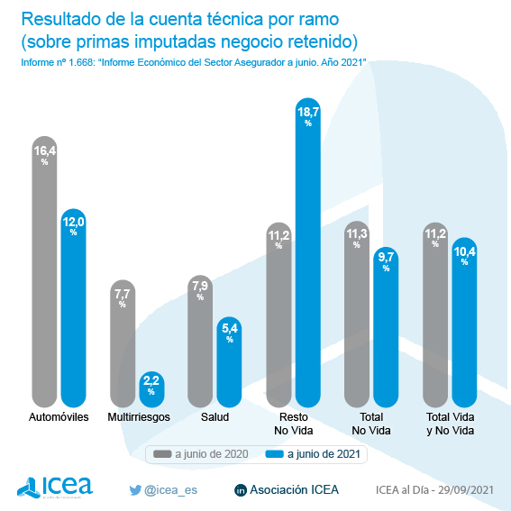 En junio de 2021, el resultado de la cuenta técnica del seguro -expresada en base a las primas imputadas retenidas- se situó en el 10,4%, lo que significa 8 décimas por debajo del índice obtenido un año antes, que fue del 11,2%, según la información facilitada por ICEA.