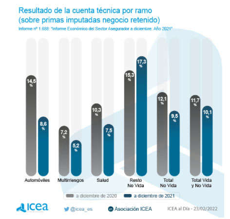El resultado de la cuenta técnica del seguro a diciembre de 2021 se situó en el 10,1% expresado en primas imputadas retenidas. Esta cifra es 1,6 pp inferior al dato registrado un año antes, según los datos de ICEA. Por su parte, la tasa de siniestralidad del negocio directo, incluyendo el reaseguro aceptado fue del 83,6%, un punto y seis décimas por encima de la que hubo al cierre de 2020.