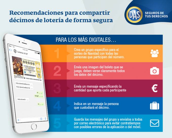 Los expertos de la aseguradora recomiendan crear un grupo específico para compartir cada décimo, enviar una imagen del boleto que se juega, detallar quién custodiará el décimo y, por último, señala que es importante guardar los mensajes del grupo.