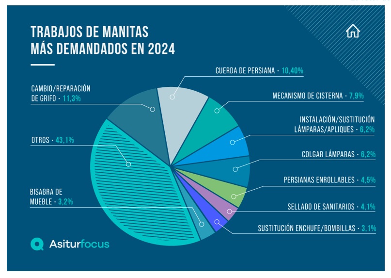 Dentro de la tipología de servicios de Bricohogar, entre los trabajos que más se solicitan destacan de forma recurrente en los últimos años el cambio o reparación de grifos, que supone el 11,3% del total de tareas del servicio de manitas en el último año, o la sustitución de cuerdas de persianas, que representa un 10,4% del total en el mismo periodo. También son frecuentes los arreglos de mecanismos de cisterna, 7,9% del total, la instalación de lámparas y apliques y el sellado de sanitarios, que suponen un 6,2% y un 4,1% respectivamente.