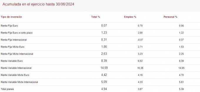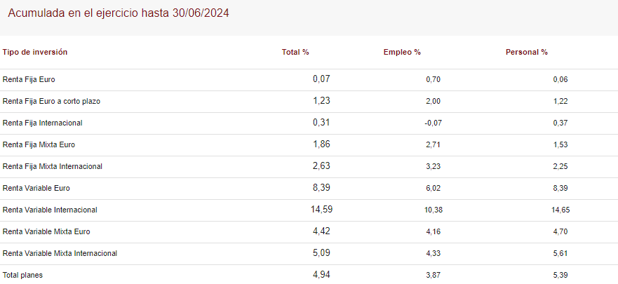 La DGSFP ha publicado en su página web una tabla con las rentabilidades de los Planes de Pensiones comunicadas por las gestoras al supervisor. De ahí se extrae que, a 30 de junio de 2024, la rentabilidad media acumulada se sitúa en el 4,94%, casi la mitad de la rentabilidad con la que acabó el ejercicio 2023. Por tipo de inversión, la renta variable está creciendo a mucho mayor ritmo, especialmente la renta variable internacional (14,59%) y la renta variable euro (8,39%).
