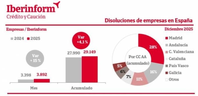 Según datos facilitados por Iberinform, la disolución de empresas aumento un 4,1% en 2025. Solo en el mes de diciembre, se incrementó un 15% y han sido la comunidad Valenciana (11%) y Cataluña (7%) las dos Comunidades más afectadas.
